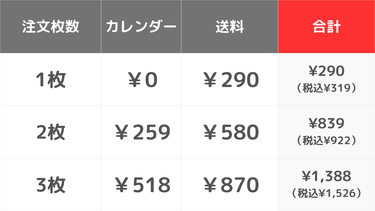 本体1枚目¥0、本体2枚目¥259/送料¥290×2件分 → 合計¥839(税込¥922)カレンダー3枚お届けの場合