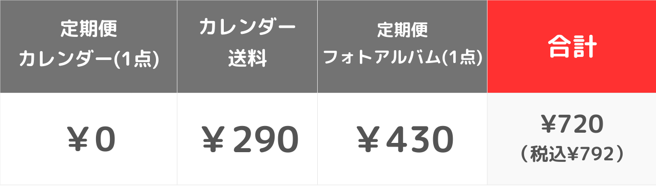カレンダー本体 ¥0/カレンダー送料¥290/アルバム本体¥430 → 合計¥720(税込¥792)